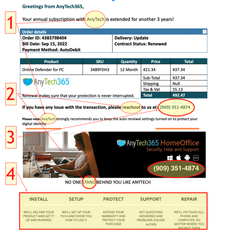 3. FAKE phone number: Perhaps the biggest red flag is that the phone number in this email message is fake. A quick reverse lookup tells you that the phone number in this email is not for AnyTech365. Our number is widely published throughout our website: 917-341-2235.